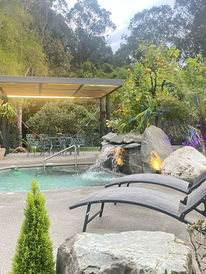 En un espacio de 9m2 se construyó una piscina con forma orgánica y una cascada de piedra natural de rio y cantera. Al rededor del oasis se coloco piedras planas creando mesas y asientos rodeados de naturaleza, permitiendo integrar a todo el proyecto que posee las circulaciones y espacios diseñados con formas organicas.