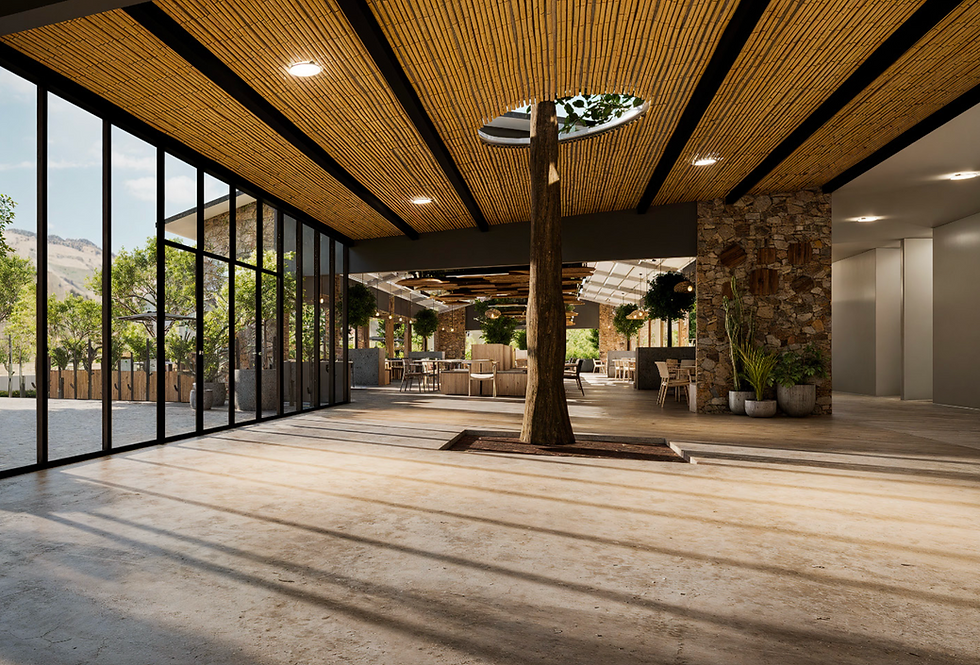 Patio de comidas bajo un concepto de trato justo y comercio local, promoviéndo el cuidado del agua y conservación de los árboles.